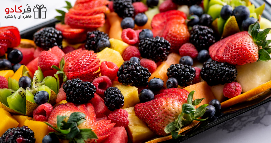 میوههای فصل مثل پرتقال، سیب و خرمالو را میتوانید در کنار هندوانه و انار بچینید. حتی میتوانید با کمی هنر، آنها را به شکل گل یا قلب برش دهید.